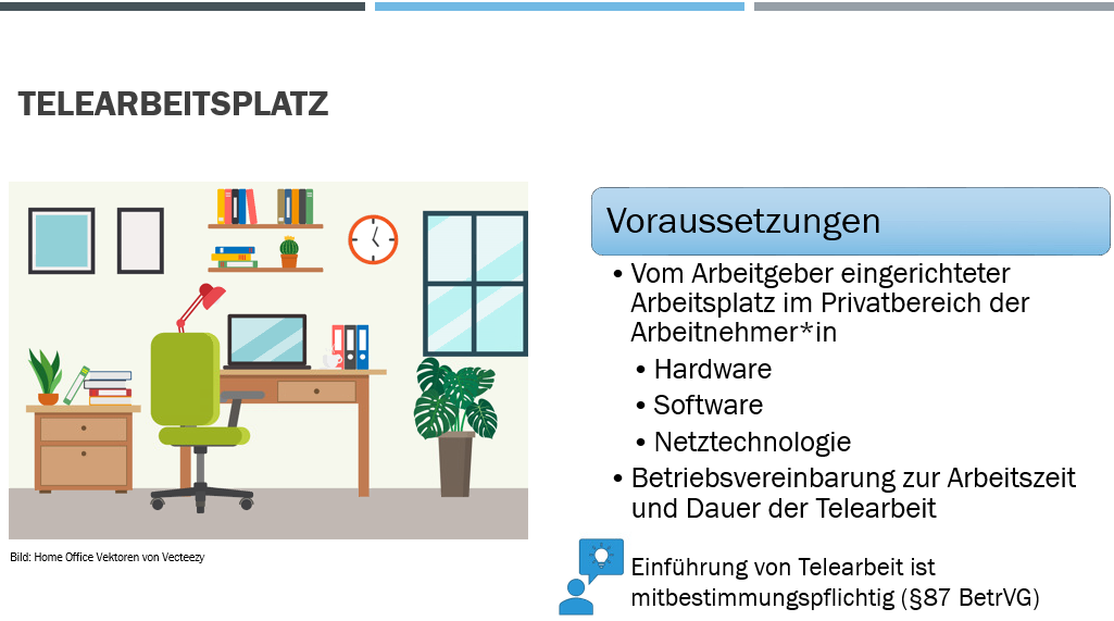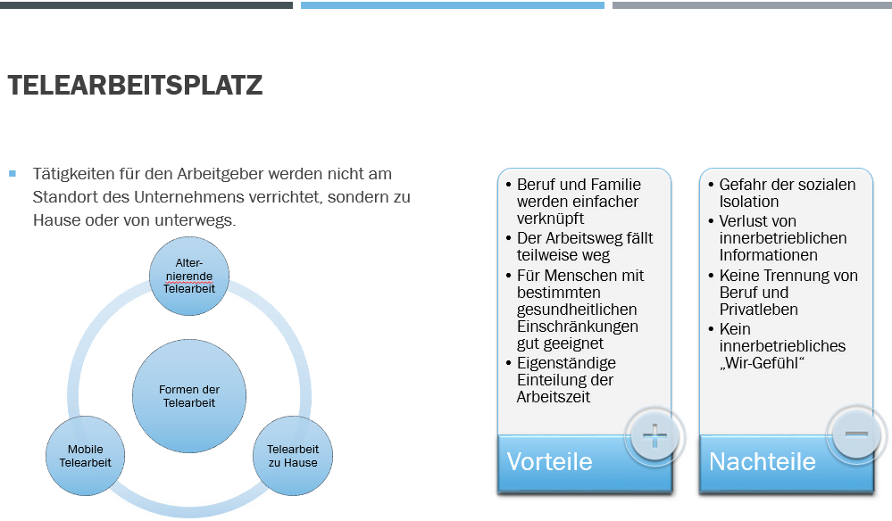 Abhängig von der Gestaltung des Arbeitsvertrages und der erforderlichen Leistung kann Telearbeit auch alternierend stattfinden. Konkret bedeutet dies, dass der Telearbeiter einen Teil seiner Arbeitszeit am Firmenstandort verbringt und somit der betriebliche Arbeitsplatz erhalten bleibt. Es bedarf genauer Absprachen zu welchen Zeiten im Home-Office gearbeitet wird und wann die Präsenz am Arbeitsplatz erforderlich ist.