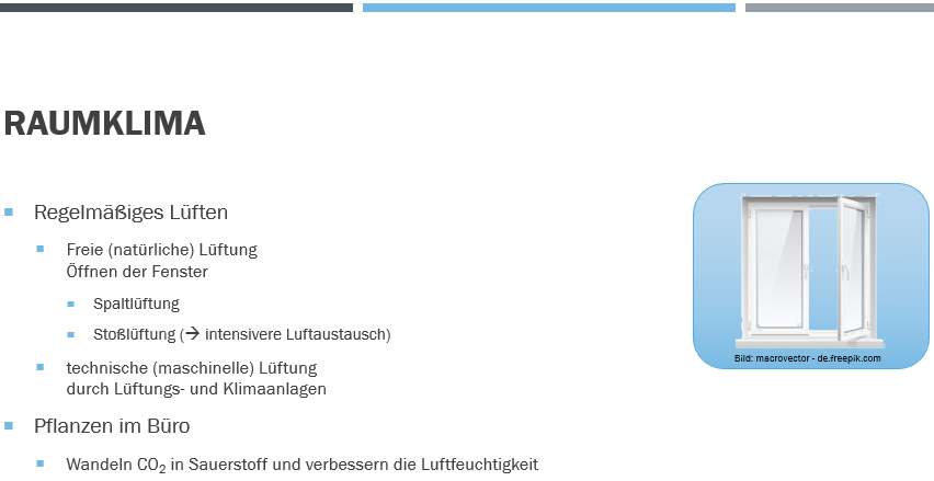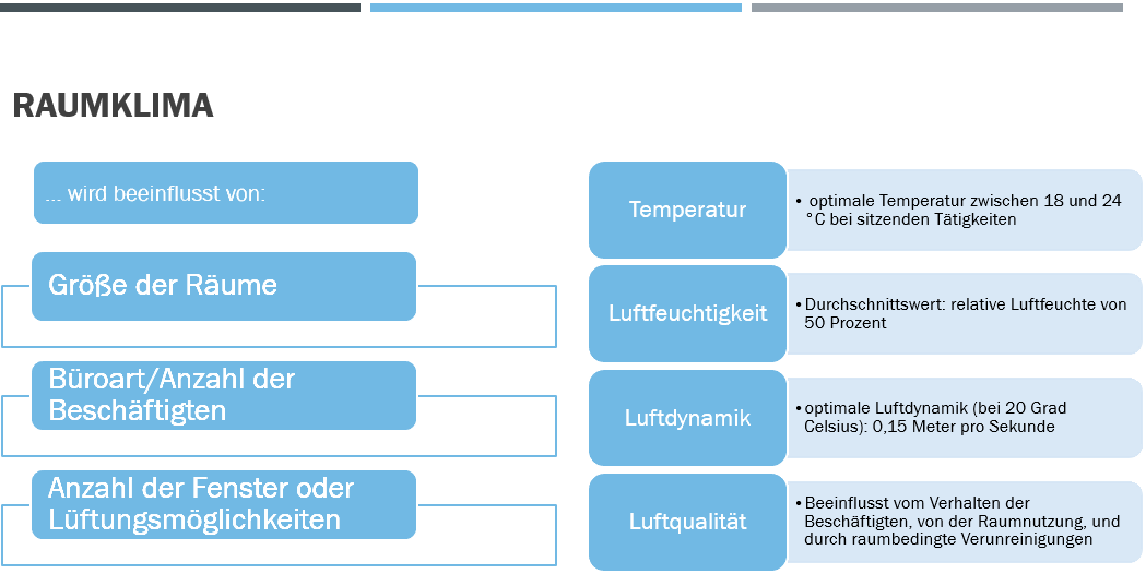 Das Raumklima wird desweiteren vom Verhalten der Beschäftigten, z. B. Rauchen, von der Raumnutzung, z. B. Anzahl der Beschäftigten, benutzte Geräte, und durch raumbedingte Verunreinigungen, z. B. Staub, Gerüche, Ausdünstungen aus Baumaterialien und Einrichtungen, beeinflusst