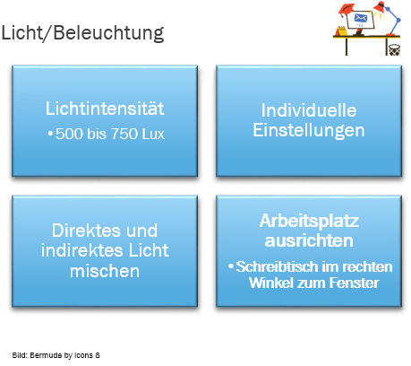 - Licht für Rechtshänder sollte von links oben auf den Arbeitsplatz fallen