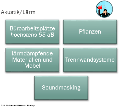 Bereits ein Geräuschpegel von 55 Dezibel wird von den meisten Menschen als Stress empfunden. In einem Großraumbüro herrschen im Schnitt sogar 70 Dezibel. Das entspricht in etwa dem Geräusch eines Rasenmähers.