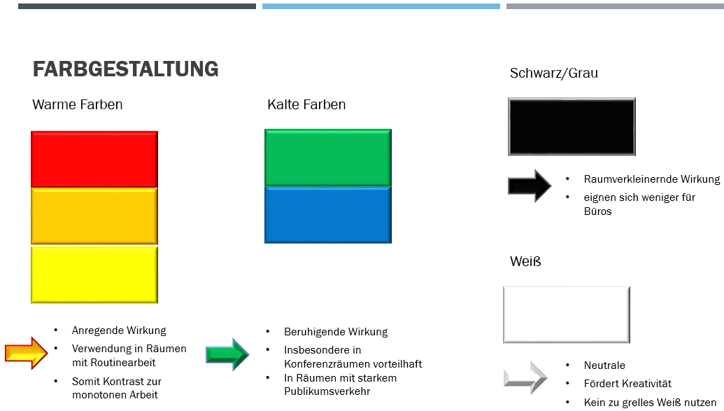 In jedem Unternehmen findet man unterschiedliche Aufgaben und Arbeitsabläufe vor. Eine individuelle und passende Auswahl der Arbeitsumgebung muss in jedem Unternehmen erfolgen. Gesichtspunkte wie Ökologien, Ergonomie, Büroform und gesetzliche Vorschriften sowie andere Einflussfaktoren müssen aufmeksam beachtet und laufend überprüft werden.