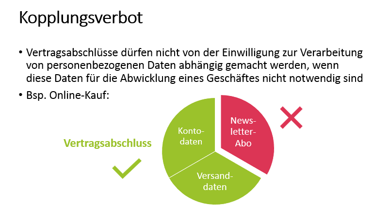 - Vertragsabschlüsse dürfen nicht von der Einwilligung zur Verarbeitung von personenbezogenen Daten abhängig gemacht werden, wenn diese Daten für die Abwicklung eines Geschäftes nicht notwendig sind