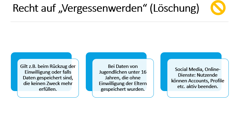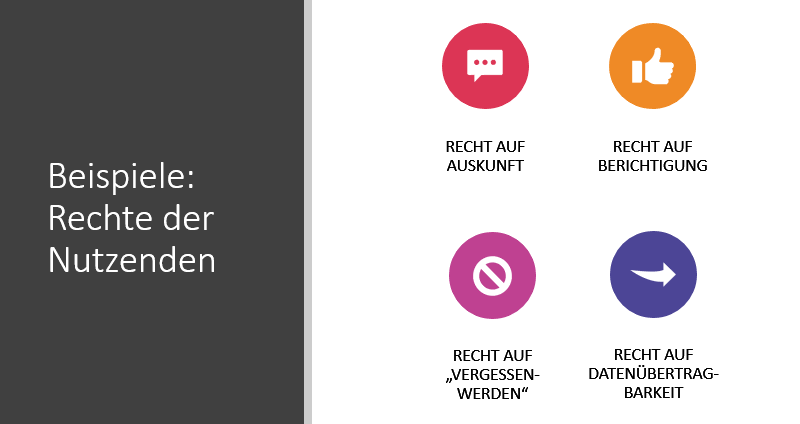 - Stillschweigende Einwilligungserklärungen, die für die Nutzenden nur erkennbar sind, wenn sie sich die Mühe machen, die Allgemeinen Nutzungsbedingungen von Angeboten genau zu lesen, sind nach der DSGVO nicht rechtmäßig (z.B. dürfen Zustimmungskästchen nicht mehr standardmäßig angekreuzt sein)