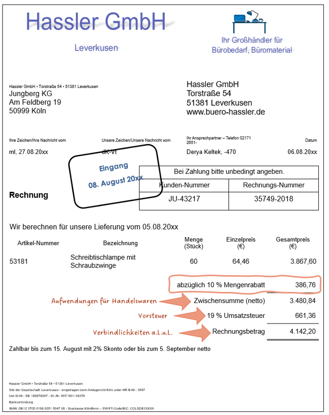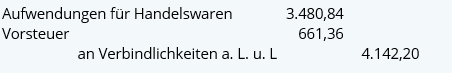 Bei dem Beleg handelt es sich um eine Eingangsrechnung für den Zielkauf von Handelswaren. Der Rabatt wird bei der Buchung der Rechnung nicht berücksichtigt. Als Betrag für das Konto Aufwendungen für Handelswaren wird der verminderte Netto-Preis von 3.480,84 gebucht. Die Umsatzsteuer auf den verminderten Nettopreis wird auf dem Konto Vorsteuer, der Rechnungsbetrag auf dem Konto Verbindlichkeiten gebucht.