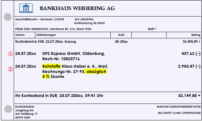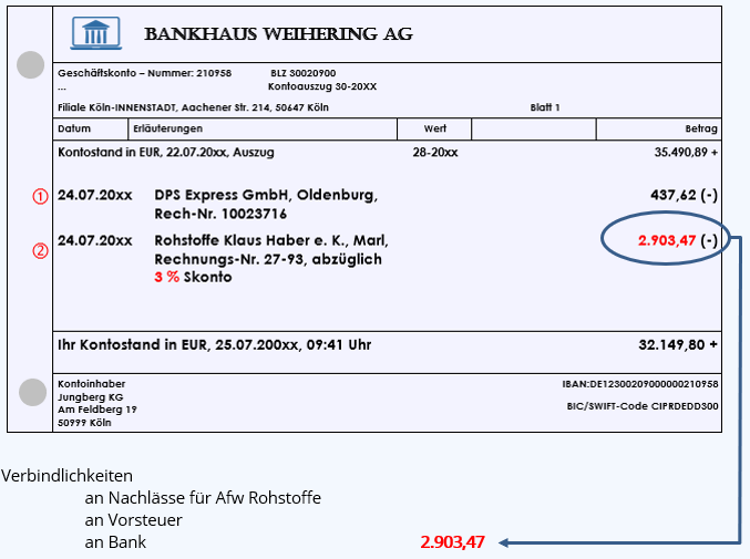 Am 24.07.20xx überweist das Unternehmen den Rechnungsbetrag abzüglich Skonto an den Lieferanten.
