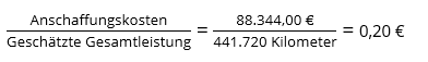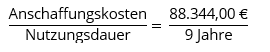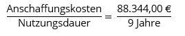<p style="border-width:1px; border-style:solid; border-color:grey; padding:1.0em; text-align:justify;">Der Buchwert am Ende des Jahrs der Anschaffung beträgt 66.258,00 €. (➥ Buchwert am Ende des ersten Nutzungsjahres = Anschaffungskosten – Abschreibungsbetrag = 88.344,00 – 22.086,00)</p>