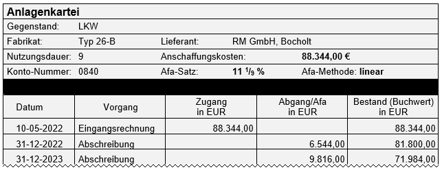 Für das Anschaffungsjahr beträgt der Abschreibungsbetrag 22.086,00 € (➥ 25 % von 88.344,00).