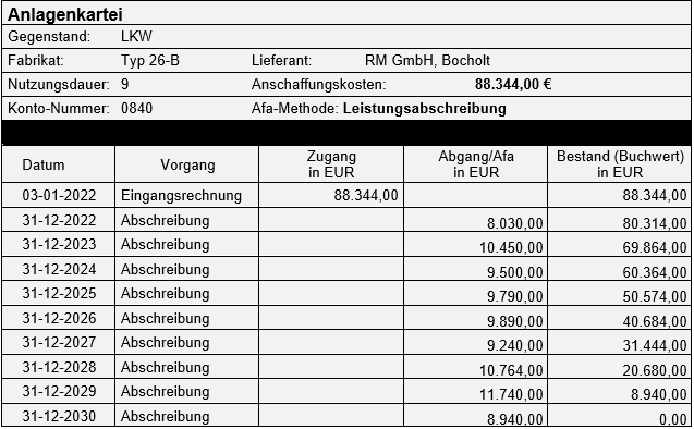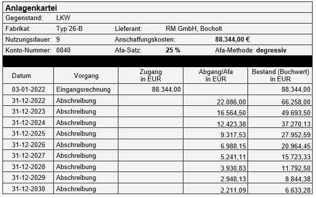 Die Anlagenkartei zeigt die Entwicklung der Abschreibungsbeträge. Für die Berechnung gilt immer: