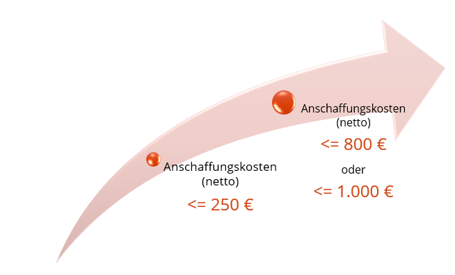 Dabei sind bei den Anschaffungs- oder Herstellungskosten zwei Grenzen zu beachten, die hinsichtlich der bilanziellen Möglichkeiten der Abschreibung von Geringwertigen Wirtschaftsgütern mit entscheidend sind.