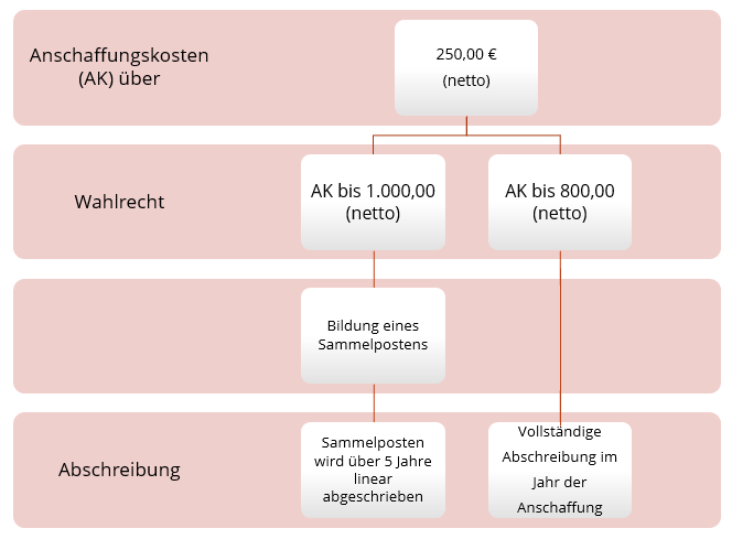 Bei Geringwertigen Wirtschaftsgütern Anschaffungskosten über 250,00 € hat das Unternehmen ein Wahlrecht zwischen zwei Abschreibungsmöglichkeiten.