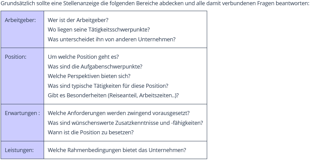 • die Anforderungen an den Stelleninhaber (z. B. abgeschlossene kaufmännische Ausbildung, Verhandlungsgewandtheit ...)