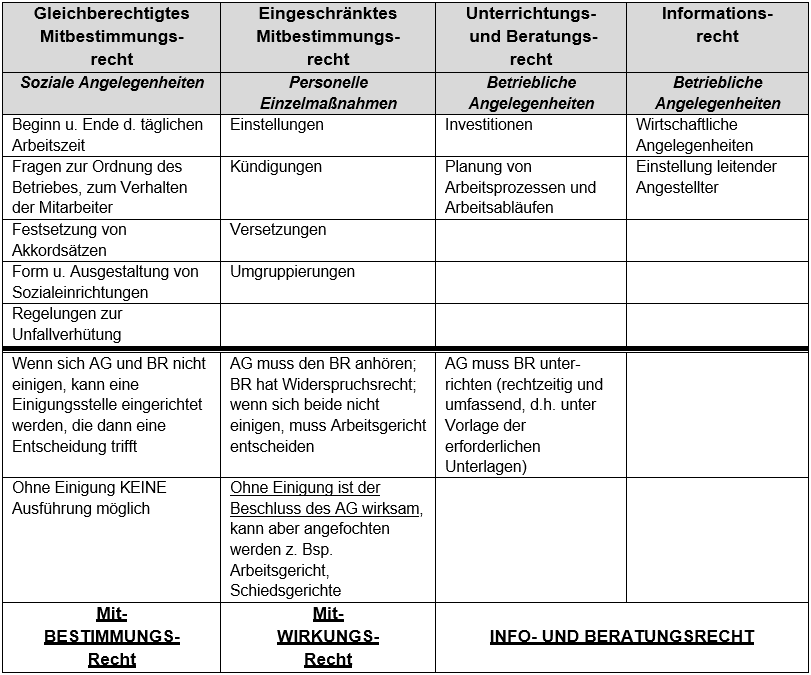 - in beiden Fällen spricht man vom Unterrichtungs- und Beratungsrecht (nicht jedoch von Mitbestimmung)