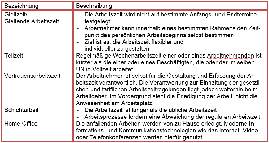 Die tägliche Arbeitszeit ist durch das Arbeitsrecht geregelt und richtet sich oft nach Tarifverträgen. (gemäß ArbZG 8 Stunden täglich Mo-Sa; bei Jugendlichen darf die Arbeitszeit täglich 8 Stunden, wöchentlich 40 Stunden nicht überschreiten und an nicht mehr als 5 Tagen pro Woche stattfinden)