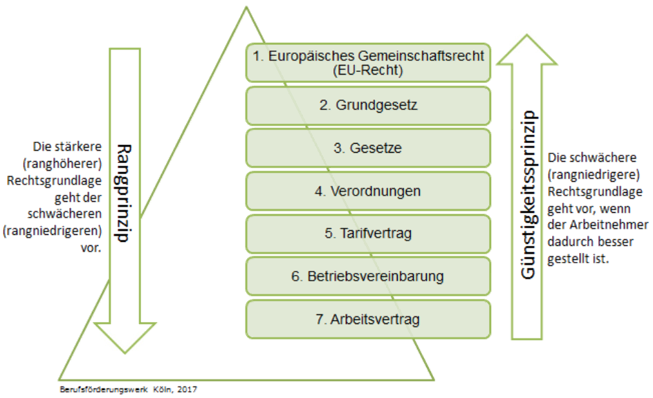 Im Arbeitsrecht gilt zunächst das Rangprinzip, d.h. dass ranghöhere Vorschriften gegenüber rangniedrigeren Vorschriften vorgehen. Eine Betriebsvereinbarung darf also z. B. nicht gegen eine Regelung des Tarifvertrags verstoßen.
