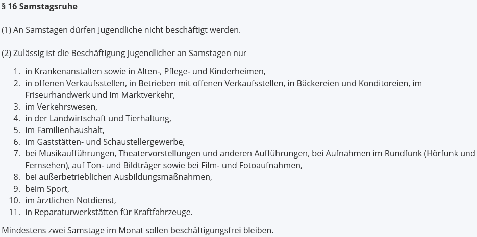 Jugendliche dürfen an Samstagen laut § 16 Jugendarbeitsschutzgesetz nicht beschäftigt werden. Es gibt allerdings laut § 16 JArbSchG viele Ausnahmen, zum Beispiel im Handel und im Gastgewerbe. Wenn Jugendliche an einem Samstag arbeiten, ist das Prinzip der Fünf-Tage-Woche durch eine Freistellung an einem anderen Tag derselben Woche sicherzustellen. Minderjährige Azubis sollen dabei an zwei Samstagen im Monat frei haben.