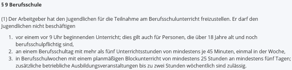 Jugendliche müssen laut § 9 JArbSchG während der Ausbildung für den Besuch der Berufsschule freigestellt werden. Ein Berufsschultag in der Woche, der mehr als fünf Unterrichtsstunden umfasst, muss pauschal mit acht Stunden auf die Arbeitszeit angerechnet werden. Bei einem zweiten Berufsschultag wird die Unterrichtzeit laut § 9 Jugendarbeitsschutzgesetz einschließlich der Pausen angerechnet. Beginnt der Unterricht der Berufsschule vor neun Uhr, dürfen Jugendliche davor nicht beschäftigt werden.