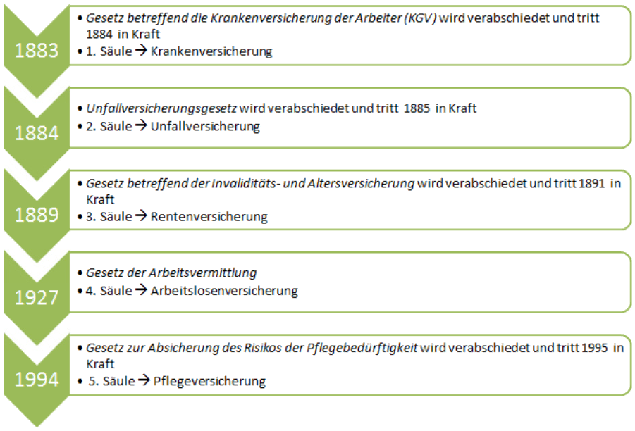 Die heute existierenden Sozialversicherungen haben ihren Ursprung am Ende des 19. Jahrhundert im Deutschen Kaiserreich. Aufgrund des wachsenden Einflusses der Sozialdemokratie sah Kaiser Wilhelm I. auf Anraten des Reichskanzlers Otto von Bismarck veranlasst, Gesetze zur finanziellen Absicherung der Arbeiter gegen Krankheit, Unfall, Invalidität und Alter zu beschließen. Bis zur Einführung diese Absicherung waren die Menschen nicht versichert.