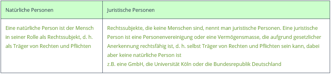 - JURISTISCHE PERSONEN: Rechtssubjekte, die keine Menschen sind, nennt man juristische Personen. Eine juristische Person ist eine Personenvereinigung oder eine Vermögensmasse, die aufgrund gesetzlicher Anerkennung rechtsfähig ist, d. h. selbst Träger von Rechten und Pflichten sein kann, dabei aber keine natürliche Person ist z.B. eine GmbH, die Universität Köln oder die Bundesrepublik Deutschland