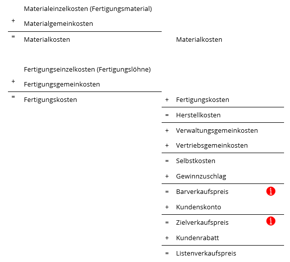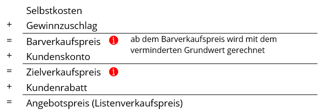 Um den Angebotspreis, auch Listenverkaufspreis, zu ermitteln, werden auf die Selbstkosten der Gewinnzuschlag sowie ggf. gewährte Kundenrabatte und Kundenskonti aufaddiert.
