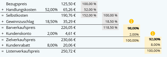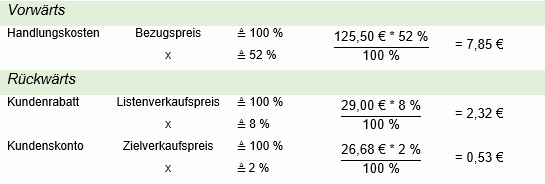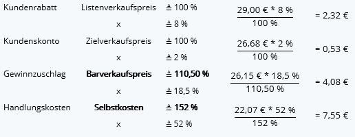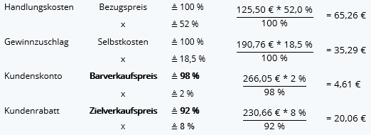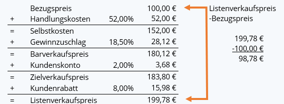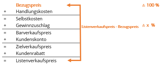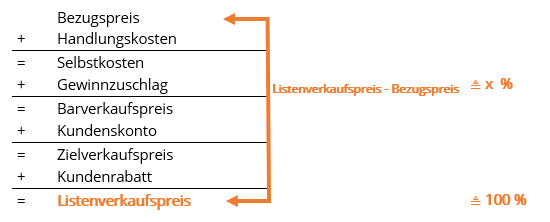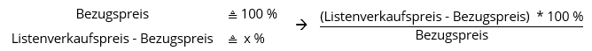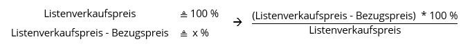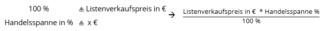 Der Listenverkaufspreis ist die Bezugsgröße (100 %). Mit Hilfe der Handelsspanne errechnet man dann den Abschlag vom Listenverkaufspreis zum Bezugspreis in Prozent. Die Differenz zwischen Listenverkaufspreis und Bezugspreis wird als Prozentwert berechnet.