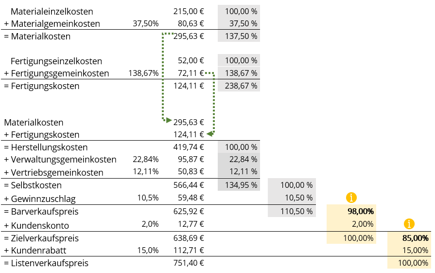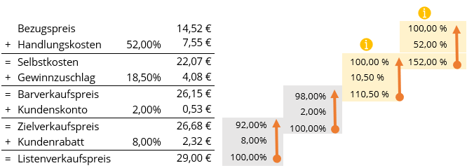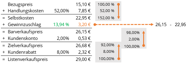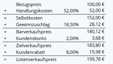 Bis zu den Selbstkosten wird vorwärts, bis zum Barverkaufspreis wird rückwärts gerechnet. Die Differenz zwischen Barverkaufspreis und Selbstkosten ergibt den Gewinnzuschlag in Euro.