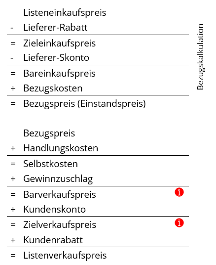 Um den Listenverkaufspreis für Handelswaren zu ermitteln, wird die Handelskalkulation durchführt. Sie baut auf die Bezugskalkulation auf.