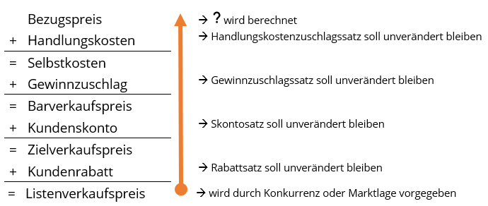Auf dem Markt tritt eine weitere Konkurrenz auf. Der bisher kalkulierte Angebotspreis ist auf dem Markt nicht mehr durchsetzbar. Wenn alle Vorgaben beibehalten werden, dann muss der Bezugspreis gesenkt werden. Zu Berechnung der Bezugskosten wird vom Listenverkaufspreis rückwärts kalkuliert.