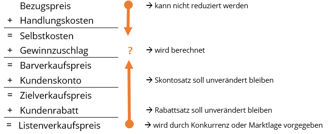Ist der Listenverkaufspreis durch die Konkurrenz oder Marktlage vorgegeben und ein günstiger Bezugspreis nicht erzielbar, dann können ein oder mehrere andere Kalkulationsposten geändert werden.