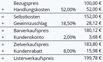 Die Rückwärtskalkulation wird bei gegebenem Listenverkaufspreis (Angebotspreis) durchgeführt.