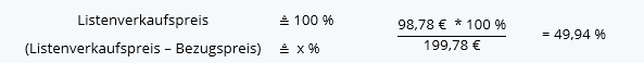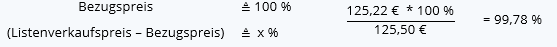 Berechnung der Differenz zwischen dem Bezugspreis und dem Listenverkaufspreis à 98,78 €. Der Listenverkaufspreis entspricht den 100 %.
