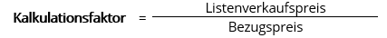 Der Kalkulationsfaktor ist der Quotient aus Listenverkaufspreis und Bezugspreis. Hieraus lässt sich folgende Formel für die Berechnung des Kalkulationsfaktors ableiten.