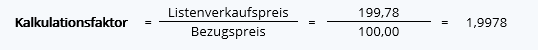 Wenn der Bezugspreis und der Kalkulationsfaktor bekannt sind, wird der Listenverkaufspreis durch die Multiplikation des Bezugspreises mit dem Kalkulationsfaktor berechnet.