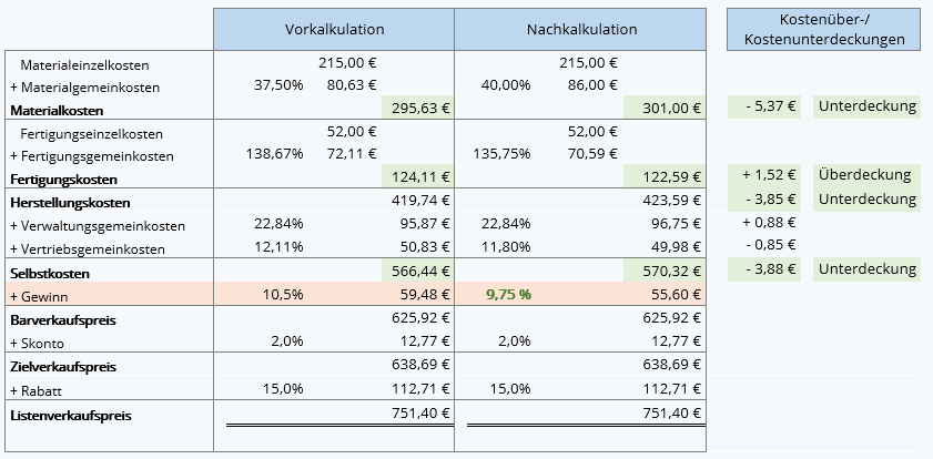 Bei der Nachkalkulation kann es zu einer Kostenunterdeckung oder Kostenüberdeckung kommen.