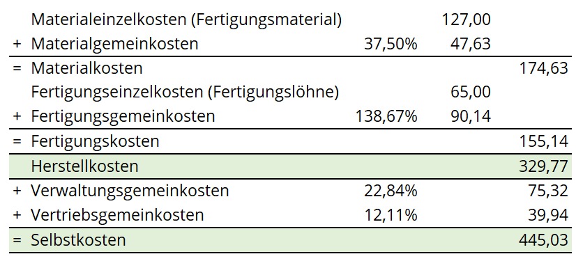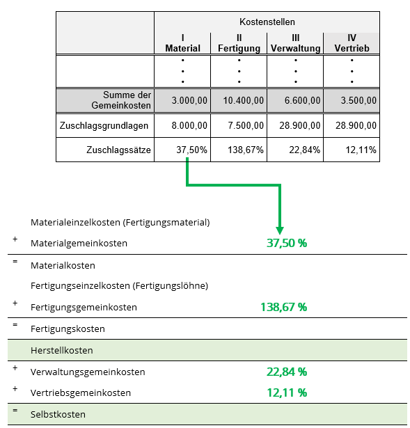 Die Zuschlagssätze, die durch den Betriebsabrechungsbogen ermittelt wurden, werden zur Ermittlung der Selbstkosten eines Kostenträgers übernommen.