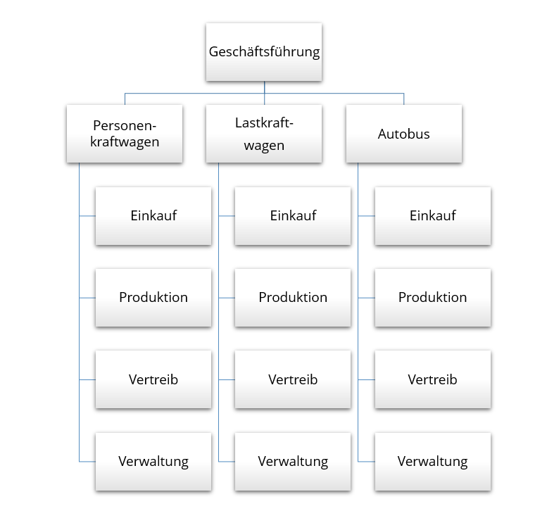 - Objektorientierte Gliederung (z. B. nach Produktgruppen), statt verrichtungsorientierter Gliederung (traditionell: Einkauf, Lager, Verkauf)
