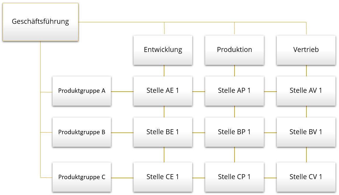eine Hierarchie nach Verrichtung (z. B. Beschaffung, Produktion, Absatz) und eine nach Objekten (Sparte 1, 2, 3) - Einschaltung der Unternehmensleitung, wenn sich Funktionsmanager und Produktmanager nicht einigen können